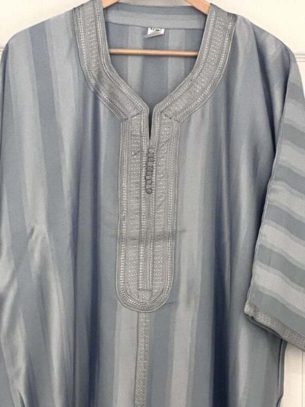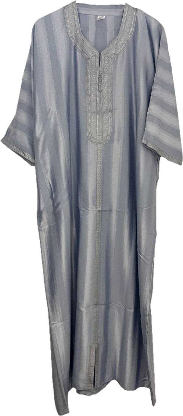 Our Blue light gray kaftan for men features an embroidered design around the neck, down the chest. It has one slit on side and one pocket on the other side at the waist level. Very elegant et practical and so comfortable.