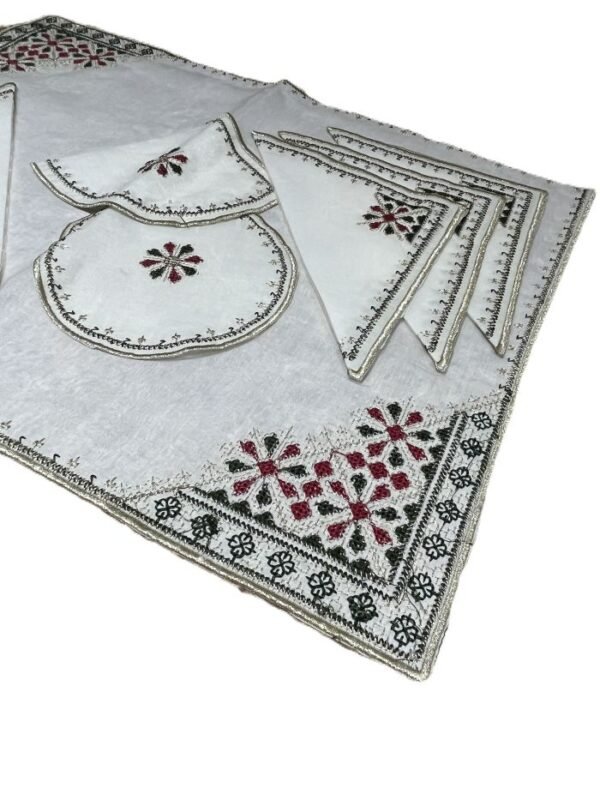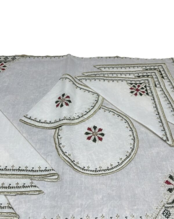 Transform your serving experience with this luxurious decorative tablecloth in gold, red and green broderies with napkins and teapot accessories. Crafted from premium fabric, this set includes: tablecloth (can be used as tray Cover) with intricate embroidery, Matching Napkins for a coordinated look, Teapot Handle & placemat for added elegance. Rich Color Palette: gold, red, and green, and detailed embroidery for a refined finish. Ideal for special occasions, tea parties, or as a thoughtful gift. This set combines functionality with timeless design to elevate your table setting and impress your guests.
