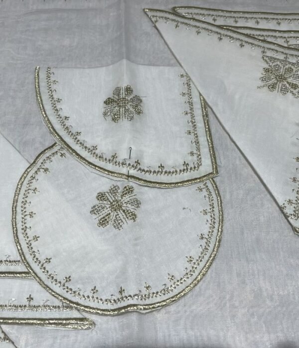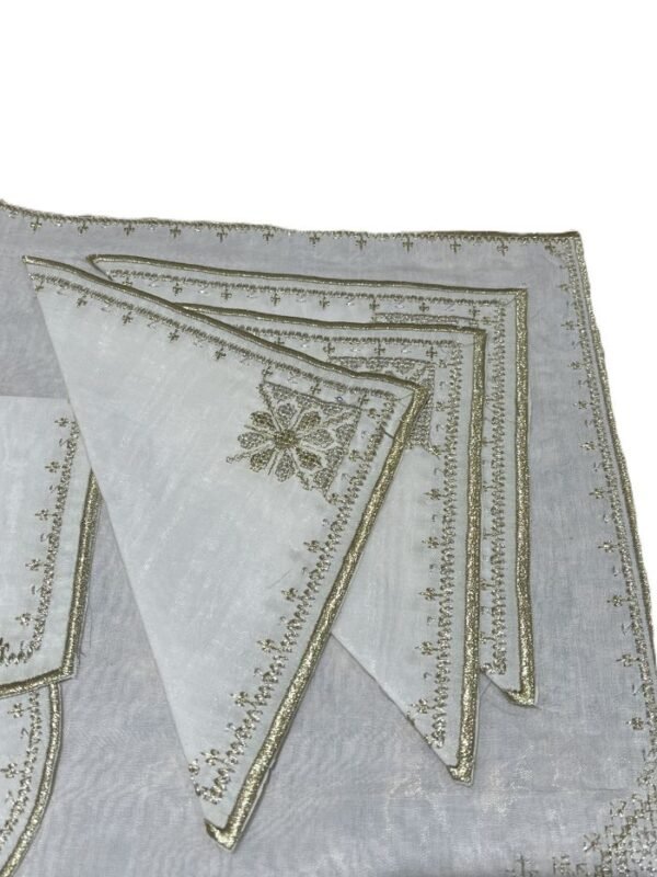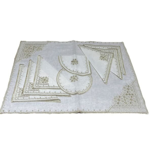 Transform your serving experience with this luxurious gold tablecloth with napkins and teapot accessories. Crafted from premium fabric, this set includes: tablecloth (can be used as tray Cover)with intricate embroidery, Matching Napkins for a coordinated look, Teapot Handle & placemat for added elegance. Rich Color Palette: gold and detailed embroidery for a refined finish. Ideal for special occasions, tea parties, or as a thoughtful gift. This set combines functionality with timeless design to elevate your table setting and impress your guests.