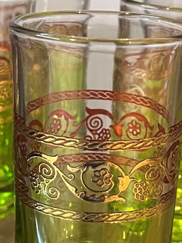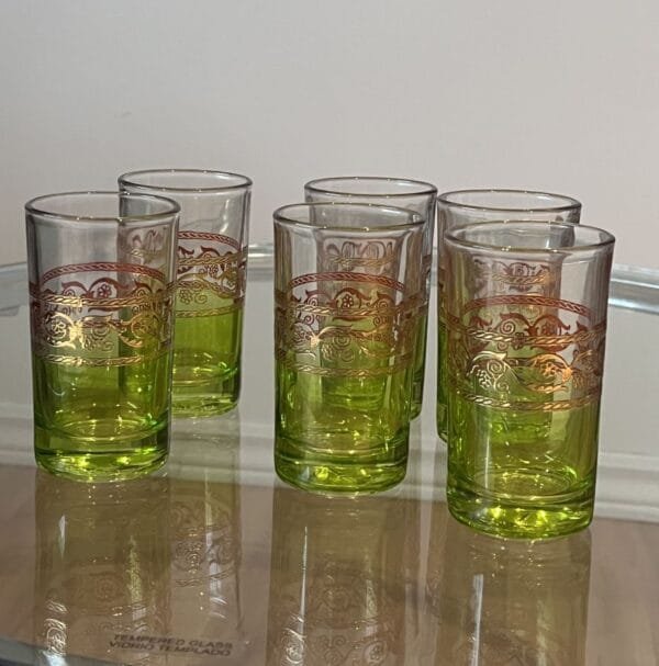 Moroccan culture places a strong emphasis on hospitality, mint tea is a part of Moroccan culture and hospitality. it is usually served in ornate tea glasses with silver teapot and tray. Serve mint tea with our serving tea glasses. Set of 6 green tea glasses with with gilded surface and floral design. They are used not just for tea, but juice or other beverages. They have become especially popular as a holder for votive candles. Hand wash