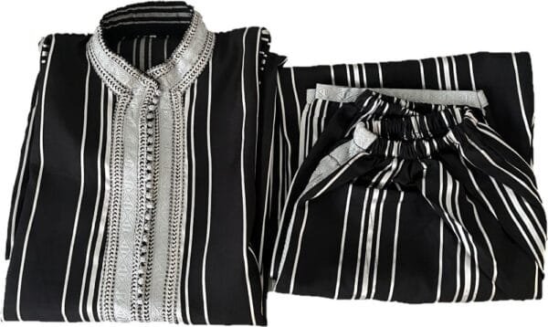 A Jabador is a traditional Moroccan outfit worn by both men and women, especially for formal occasions, celebrations, and religious gatherings, and is admired for its refined craftsmanship, detailed embroidery, and deep cultural significance. It consists of a long-sleeved tunic (Qmis or Camis) that typically falls to mid-thigh or knee length and is richly adorned with traditional sfifa embroidery along the neckline, front, and cuffs, paired with a matching Serwal, loose-fitting trousers that taper at the ankles for comfort and ease of movement. Jabadors are crafted from luxurious materials such as silk, cotton, or velvet for winter variations, and feature elegant design elements including hand-stitched embroidery with gold or silver threads, decorative handmade buttons (Aqaâd) aligned down the front, and color palettes ranging from classic neutral tones for men to rich jewel hues for women.