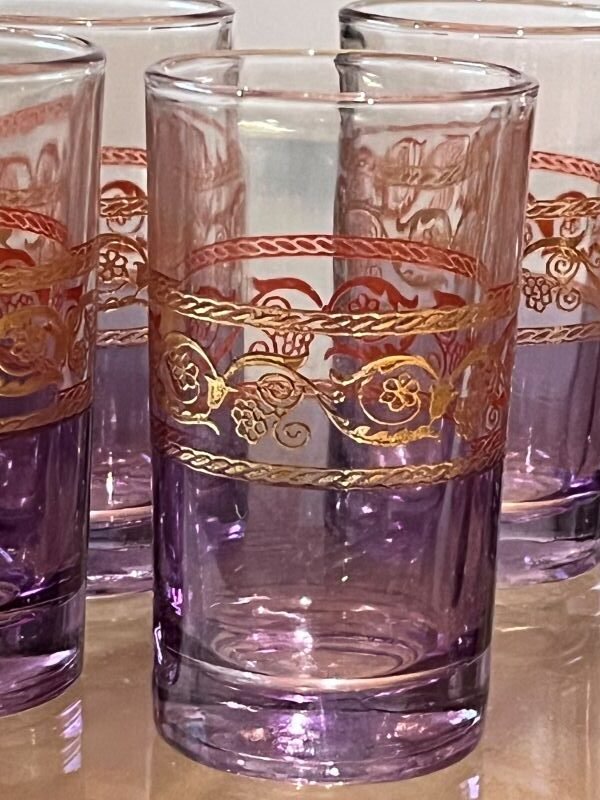 Elevate your tea-drinking experience with our exquisite set of Moroccan tea glasses, each delicately crafted with gold and color accents that reflect the artistry of Moroccan design.