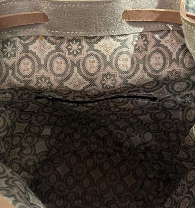 It has both leather interior drawstring closure and flap with buckle closure.