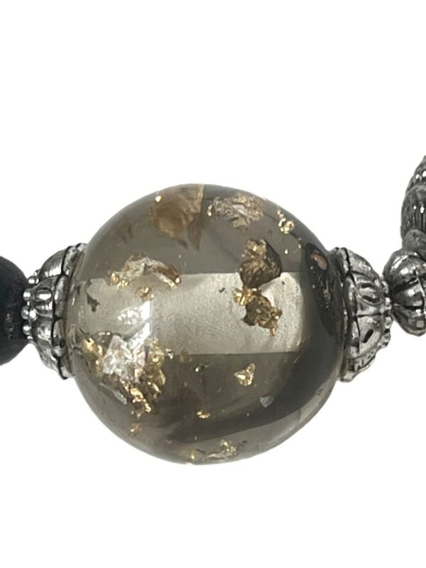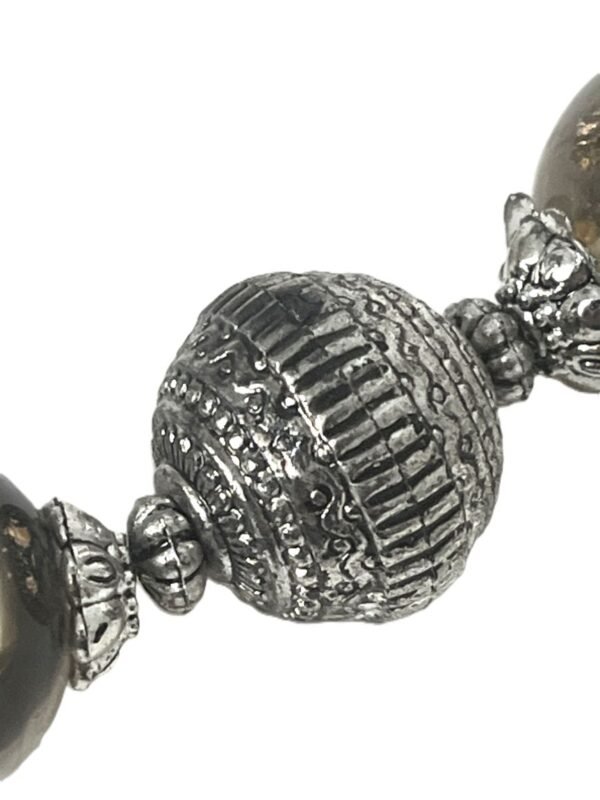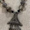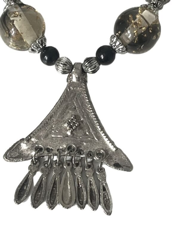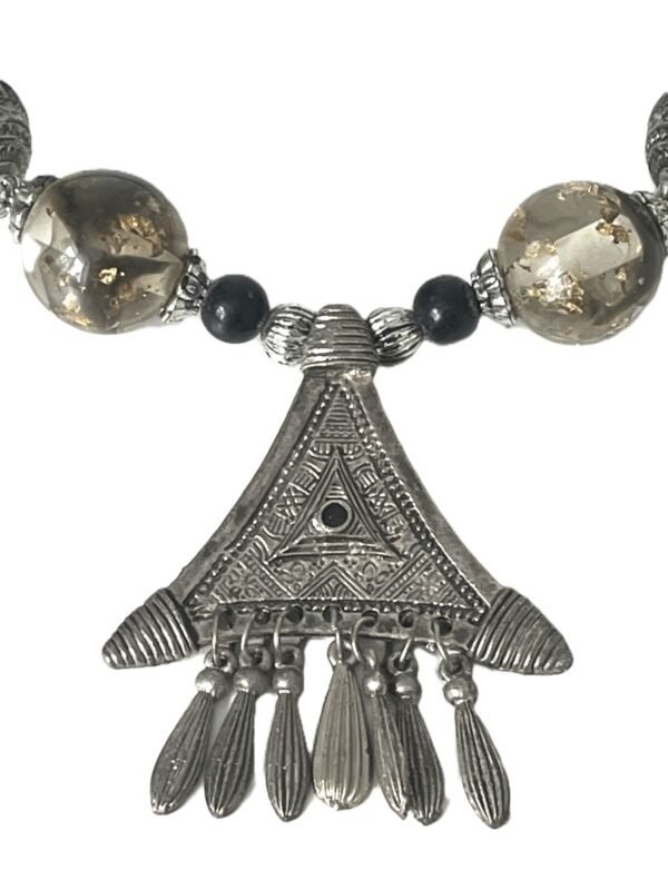 The pendant is carved with torsade wires on the corner. This triangle necklace is made of various materials silver cylindric and circular spheres, translucent stones with black and gold tones and black bills.